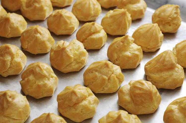 - С готовых профитролей срезаются верхушки, накладывается внутрь паштет, и срезанные верхушки ставятся на место.