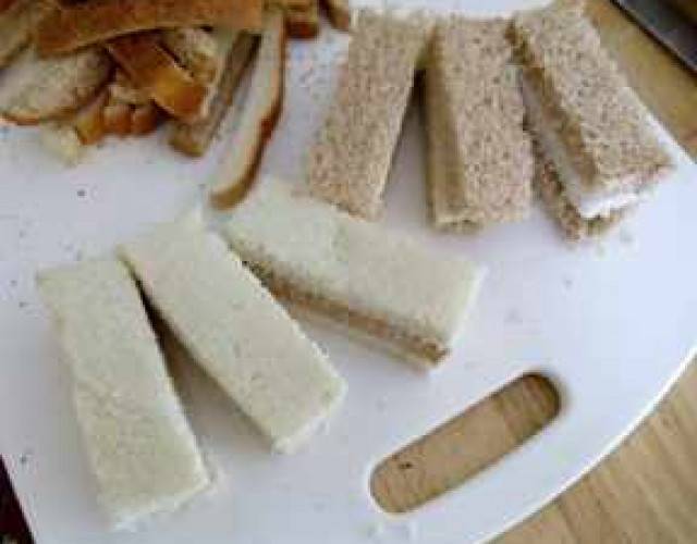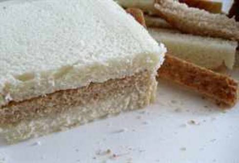 Из такого количества ингредиентов выйдет 8-10 порций. 1.Берем хлеб, обрезаем корочку и делаем ломтики прямоугольной формы одинакового размера.