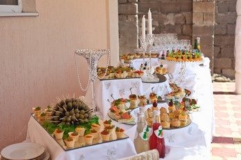 Фуршет-свадьба представляет собой накрытый праздничными закусками стол. Он не предполагает того, чтобы за ним сидели. Гости подходят к столу, берут сами тарелку и накладывают то, что посчитают нужным. Есть приходится стоя, в связи с этим на столе преобладают закуски и легкие салаты.