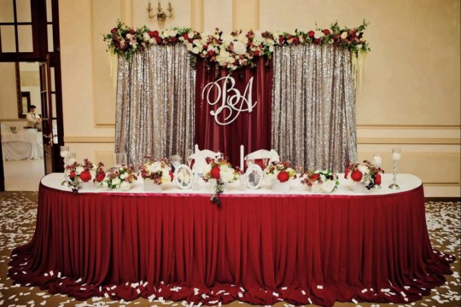 Справка: «свадебный президиум» — название особым образом украшенного стола жениха и невесты, стоящего обособленно от столиков для гостей или большого общего стола.