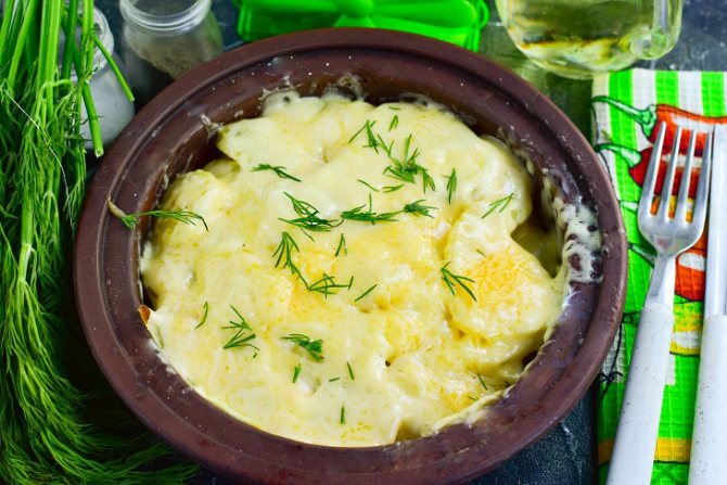 3. Нашинкованный картофель залить получившимся соусом. Запекание должно продолжаться не меньше тридцати-сорока минут
