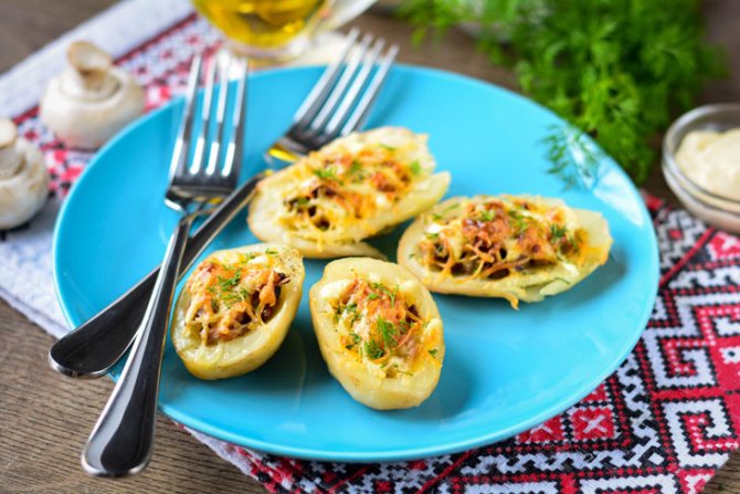 Картофельные лодочки — это просто классика жанра и мастхэв если очень хочется удивить домашних. При этом начинять клубни можно совершенно любой начинкой, начиная от бекона и заканчивая рубленными крабовыми палочками. Вариант с грибами получается очень ароматным, а также подойдет в пост. Обязательное условие – не заменять высококачественный сыр каким-либо сырным продуктом или же плавленым сырком. В этом случае вкус оригинального блюда может быть иным, чем заявлено в рецепте.