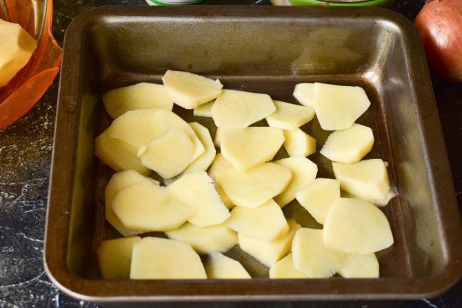 3. Картофельные клубни очистить и нашинковать слайсами. Разместить поверх остальных слоев.