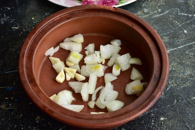 1. Если у вас есть чугунная или керамическая форма, то используйте ее. На дно нужно поместить измельчённый лук и чеснок.