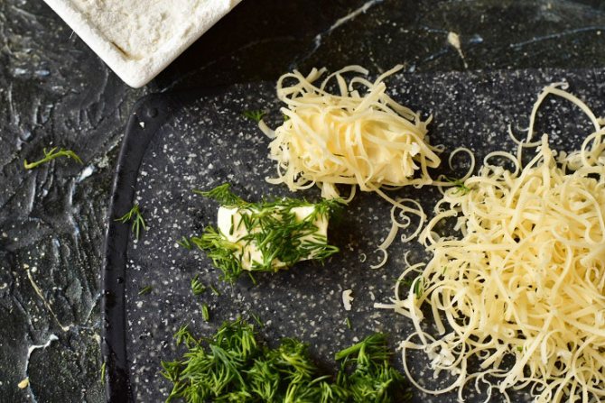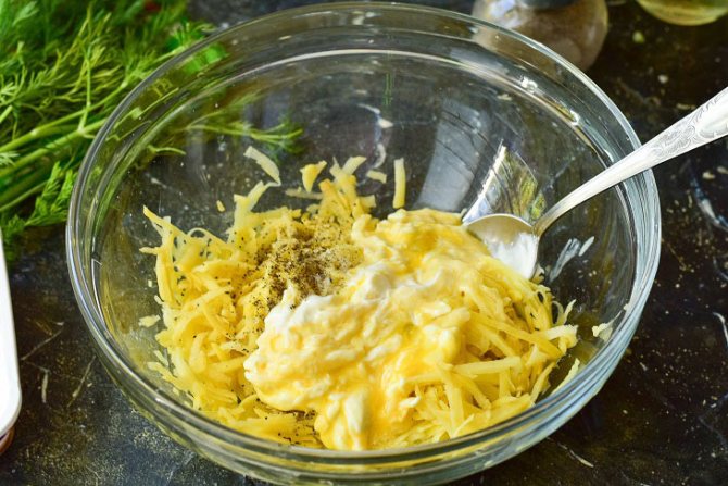Начинка для рыбки готова! Переложите в отельную миску, дайте полностью остыть. Добавьте сыр, оставшийся чеснок, специи, сушёный укроп.