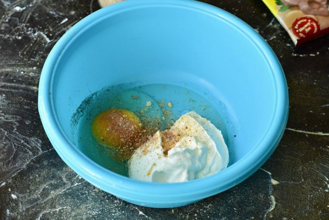2. В глубокой чашке смешать сметану любой жирности одно яйцо и специи. Лучше использовать венчик, так структура будет однородной.