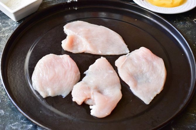 1. Филе промываем, обсушиваем и надрезаем грудку по самой широкой части, но не до конца. Получился один большой пласт.