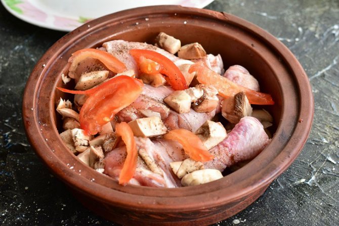 4. Теперь вылить в форму сухое вино и разместить измельченные томаты.