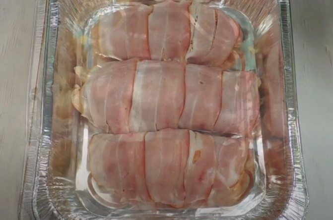 7. Далее закручиваем каждый рулет в слайсы бекона. На один рулет уходит 4 листа бекона. Сворачиваем в нахлест друг на друга. Таким образом фаршируем и закручиваем все заготовки.