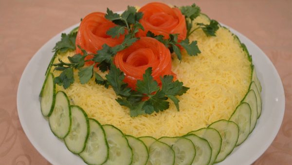 - если нет уверенности, что все гости едят майонез, можно разложить салат порционно без заправки, а рядом поставить разные соусы на выбор (это актуально только для неслоеных закусок);