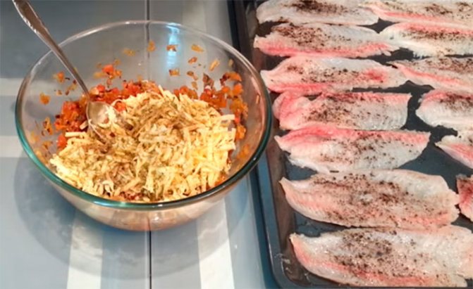 На кусочки рыбы выложите кабачки. Сверху – начинку.
