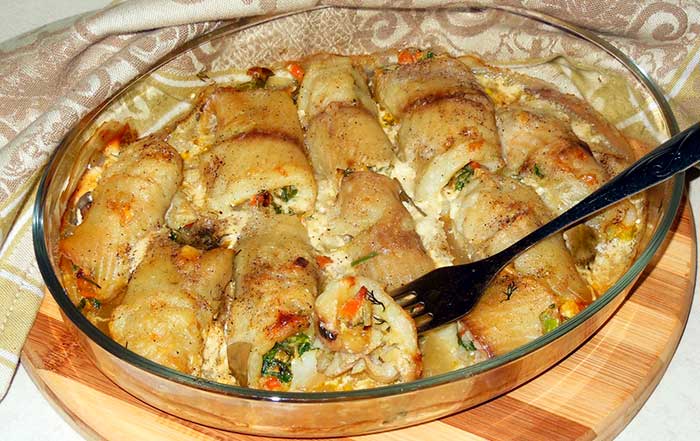 Рыбные рулетики из филе тилапии с овощами в сливках