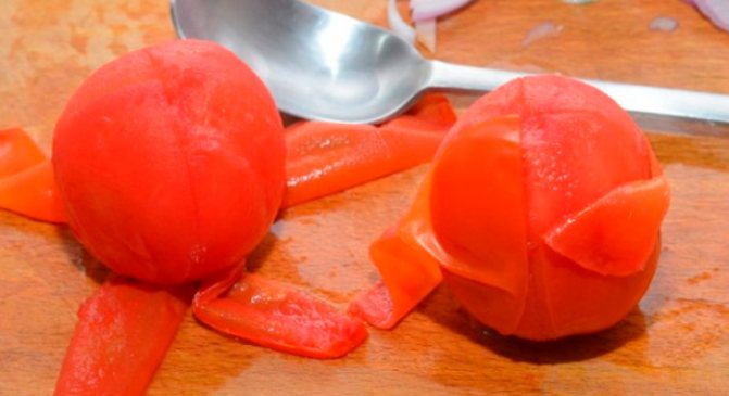 С помидоров снимите кожицу, удалите семена, нарежьте кубиками.