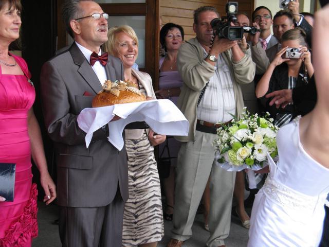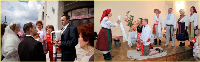 На обряде мама будущей супруги держит в руках икону Богородицы, а мама будущего мужа икону Спасителя. Перед входом в банкетный зал новоиспеченных супругов встречают их родители. Родители молодожена говорят свою напутственную речь, держа свадебный каравай и поднос с бокалами, наполненными шампанским.