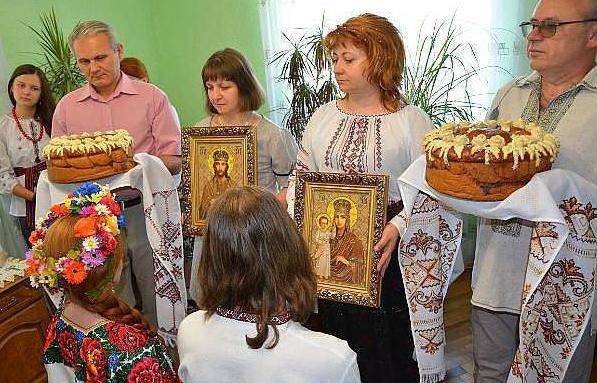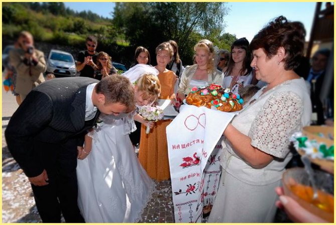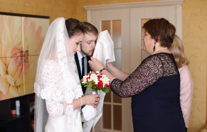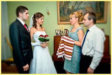 По старинному обычаю родители сначала должны перекрестить иконой жениха и невесту три раза до ЗАГСа, потом дети целуют икону. Тот же обряд повторяется и в банкетном зале. Сегодня этому обычаю следуют очень редко