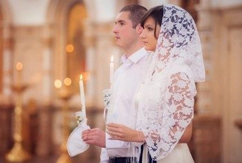 Одежда желательно должна быть закрытого типа. Если свадебное платье с глубоким вырезом, стоит накинуть шаль. Традиционно подвенечный наряд невесты состоит из платья со шлейфом и длинной фаты.