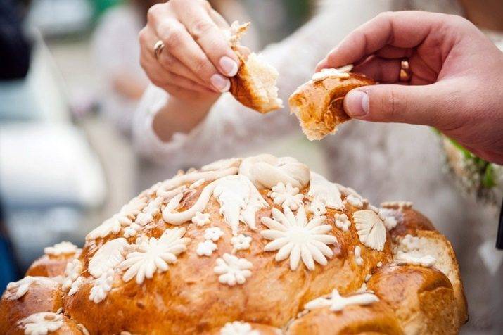 Свадебный хлеб – добрый символ каждой свадьбы. По традиции, родственники со стороны жениха должны печь каравай на свадьбу. Заранее выбирается чистоплотная замужняя женщина с крепкой семьей и здоровыми детками. Отлично, если испечет каравай крестная мать жениха. Энергетика благополучного человека приводит к согласию и богатству в новой семье. Пекут хлеб в день свадьбы, отправить в печь должен женатый мужчина. Испеченный пирог прячут от дурного глаза до момента подачи. Подавать каравай молодоженам должна свекровь после приезда из ЗАГСа или венчания на вышитом рушнике (длинном полотенце), произнося напутственную речь.