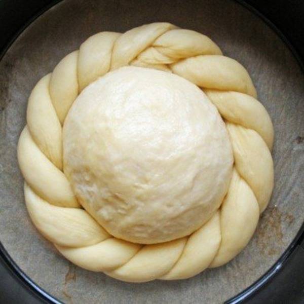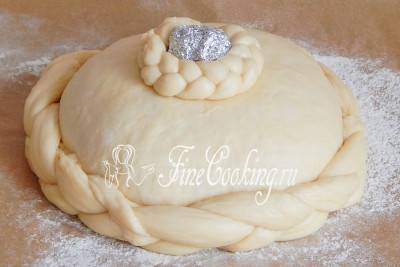 Дальше делаем маленькую косичку и кладем ее в форме кольца на вершину каравая. Это место для солонки — вставим в него шарик из пищевой фольги, чтобы углубление в процессе выпечки не выросло.