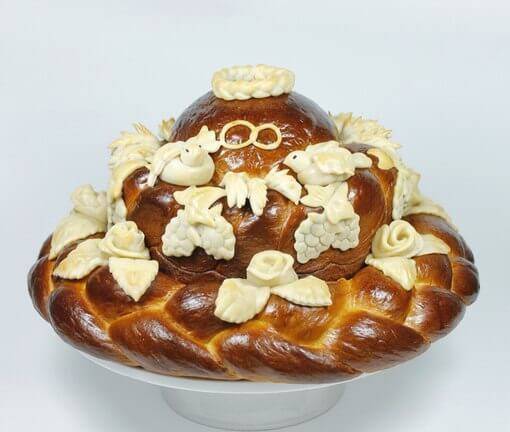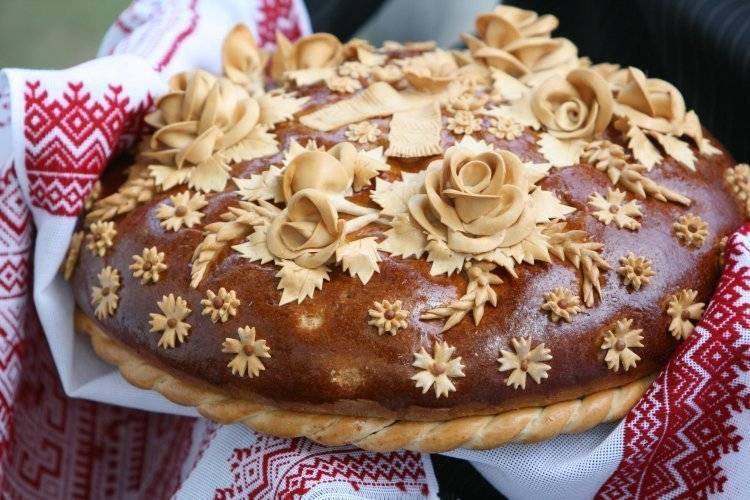 счастья, достатка в семье. Как правило, хлеб богато и изысканно украшен. Чаще всего он декорирован колосьями пшеницы из теста – они символизируют достаток в семье. Верят, что веточки калины принесут счастье и детей, а пары лебедей или же два кольца – верность в браке.