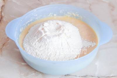 Затем подсыпаем часть просеянной пшеничной муки — примерно два стакана. Перемешиваем все.