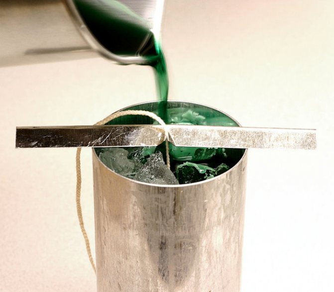 В подготовленный стаканчик с закрепленным фитилем нужно будет вылить расплавленное вещество. Обычно используется простая жестяная консервная банка, погнутая с одной стороны, чтобы получился носик для выливания.