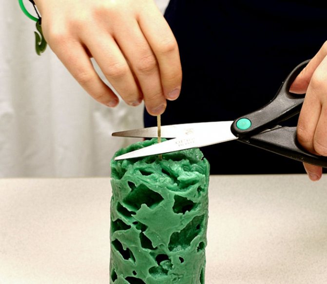 - После остывания изделия нужно распустить узелок шнура и вынуть получившуюся свечу из формы за другой кончик. Излишки фитиля можно удалить, оставив 1 см.