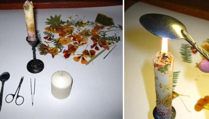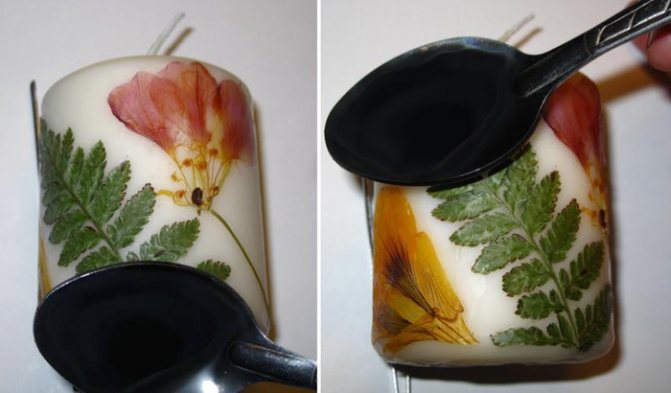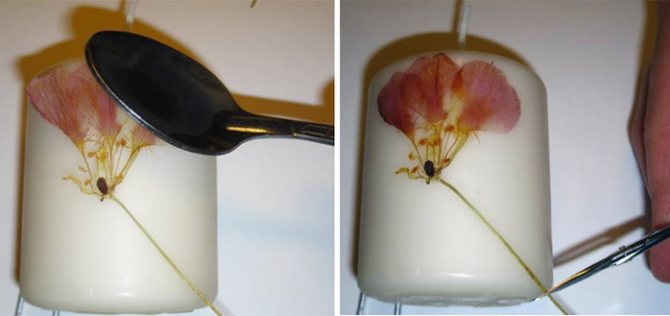 Приложите к декорируемой свече сухой цветочек и аккуратно прогладьте его лепестки внешней стороной ложки, чтоб они приплавились к парафину и не торчали. Толстые стебельки может понадобиться прогладить несколько раз, нагревая при этом ложку.