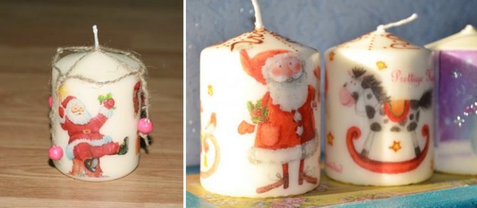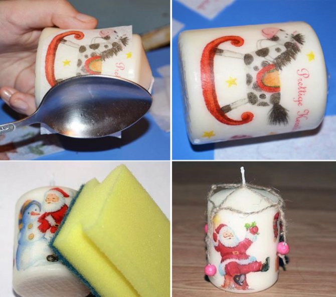 Важно, чтобы хорошо приклеилась вся салфетка. Если бумага в отдельных местах морщинится, ее аккуратно разглаживают. Вздувшиеся места надо повторно прогреть феном и плотно прижать к свече.