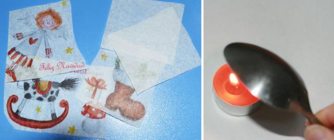 Оригинальный вариант декупажа – использование горячего воздуха или утюга вместо клея. Салфетки предварительно делят на слои, аккуратно отделяя листик с понравившимся рисунком. Из салфетки вырезают прямоугольник (по параметрам изделия). Мягкой бумагой плотно оборачивают поверхность и прогревают ее феном. Чтобы придать поделке аккуратный вид, верхнюю и нижнюю части мягкой бумаги загибают и также «приклеивают» прибором для сушки волос.