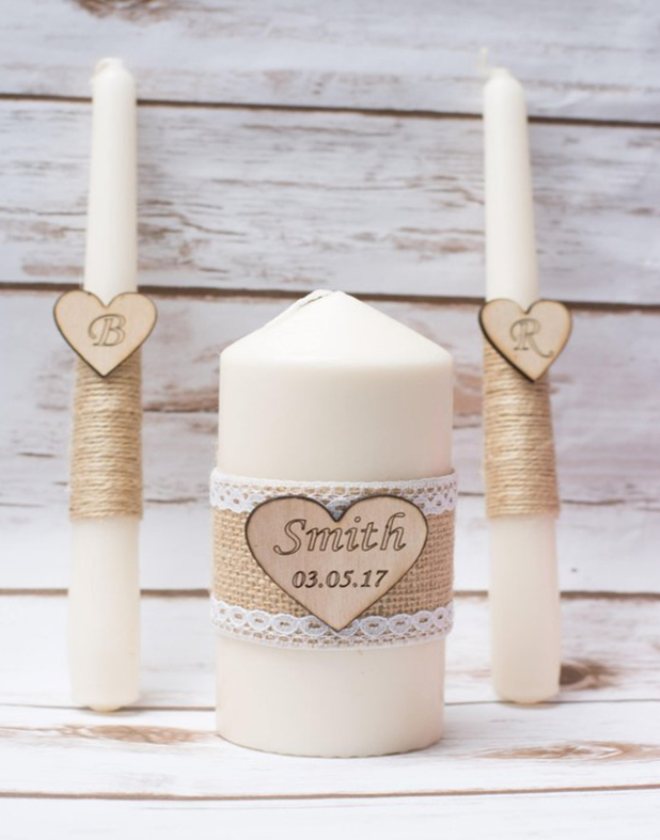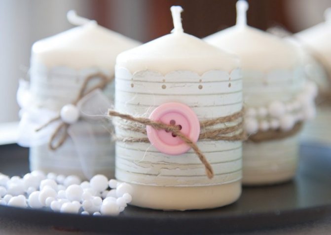 Романтично по-деревенски смотрятся свечи, украшенные шпагатом и кремовыми кружевными лентами ручной работы.