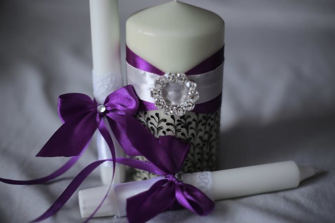 Свадебное торжество украсят свечи, декорированные кружевными или атласными лентами. Оригинальный вариант – комбинирование однотонных и кружевных полос. На изделии закрепляют ажурное полотно, поверх которого завязывают блестящий атласный бант.
