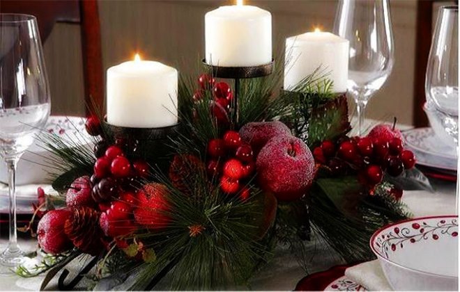 Беспроигрышный вариант – мешковина, обмотанная вокруг свечи. Маленькие декоративные шишки и крупные красные бусины-ягоды на проволочках привязывают джутовыми веревками к свечке. Всю композицию можно немного припорошить искусственным снегом.