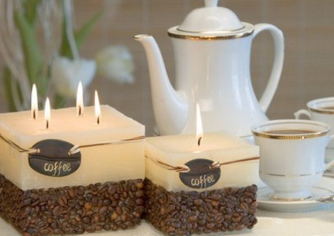 Оригинальный декор в виде кофейных зерен придаст свече элегантный вид. Благородный кофе можно применить по-разному: