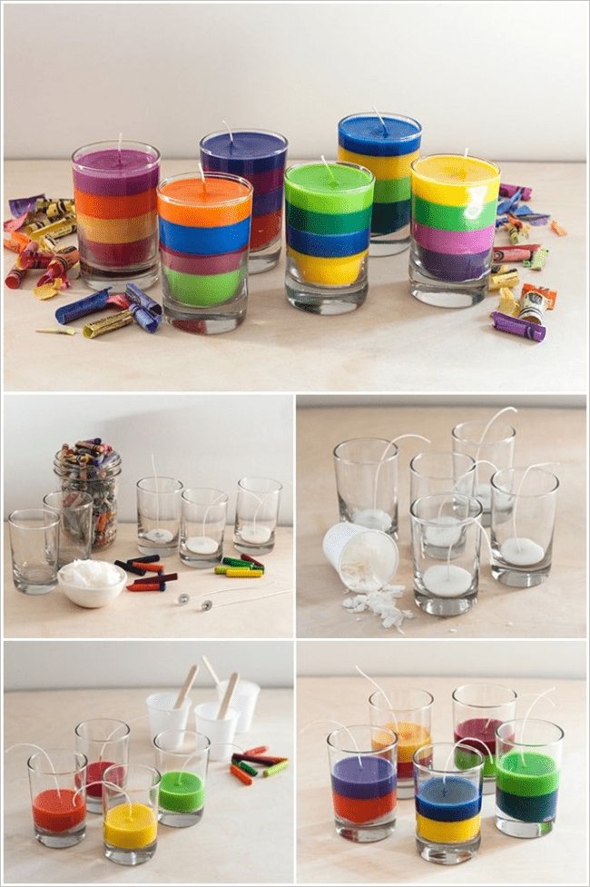 Не пытайтесь использовать водорастворимые гуашь или акварель — вас ждет фиаско. Краситель неизбежно осядет на дно или выпадет хлопьями. Готовое изделие будет выглядеть весьма непрезентабельно. ПОСУДА ДЛЯ ПЛАВЛЕНИЯ ПАРАФИНА Для того, чтоб растопить парафин, вам понадобится небольшая кастрюлька для паровой бани и железная мисочка. Опытные мастера рекомендуют топить парафин именно на паровой бане, считая остальные способы, в том числе микроволновку, пожароопасными. Рекомендуем вам для начала также воспользоваться этим, проверенным годами, способом: миску с парафином поместите в емкость с кипящей водой. Если свеча планируется цветной, мелок добавляйте сразу же и несколько раз перемешайте растапливаемую массу для получения однородного цвета. АРОМАТИЗАТОРЫ И ДЕКОР Для украшения свечей подойдут любые подручные материалы. Сначала определитесь с тематикой вашей работы. Камешки и ракушки эффектно дополнят свечи в морском стиле. Для новогодней тематики используйте бусинки, небольшие шишки, маленькие декоративные шарики, ленточки и банты. Свечи ко Дню влюбленных украсьте сердечками, блестками бантиками, высушенными цветочками, кофейными зернами и т.д. Ароматизировать домашние свечи лучше всего эфирными маслами, приобрести которые можно в ближайшей аптеке. Еще один вариант — найти на своей кухне корицу с ванилью. Добавлять ароматизаторы в растопленный парафин стоит в самом конце, после окрашивания. ПОШАГОВЫЕ МАСТЕР-КЛАССЫ Предлагаем вашему вниманию подборку доступных мастер-классов, которые помогут новичкам научиться основным техникам и приемам работы. Если вы уже умеете создавать свечи своими руками, сможете почерпнуть из них интересные идеи для воплощения в своем творчестве. Предлагаем вам создать свечи в форме сердца, которые станут незабываемым подарком вашей второй половинке ко дню святого Валентина или на день рождения. Посмотрите подробное видео создания ароматной кофейной свечи и вы убедитесь, что все даже проще, чем кажется на первый взгляд. РАЗНОЦВЕТНЫЕ СВЕЧИ СЛОЯМИ Эффектные разноцветные свечи в прозрачном стакане станут изюминкой вашего интерьера. Как их сделать, смотрите в нашем мастер-классе, иллюстрированным поэтапными фото. Материалы Перед тем, как сделать цветные свечи своими руками, подготовьте: прозрачный воск; восковые карандаши; одноразовые бумажные стаканчики; стеклянные стаканчики; фитили; палочки для мороженого; ароматические масла; микроволновую печь; терку. Шаг 1. Обычный прозрачный воск натрите на терке и заполните полученным материалом бумажные стаканчики. Заполнять их данным материалом нужно только на четверть. Шаг 2. Отправьте стаканчик в микроволновую печь на 45 секунд. Достаньте его. Воск перемешайте деревянной палочкой. Он должен растопиться полностью, если этого не произошло, отправьте стаканчик в печь еще на 30 секунд. Шаг 3. Опустите в пустой стеклянный стаканчик фитиль. Можете второй его конец прикрепить к палочке для мороженого и положить ее на верхнюю часть стаканчика. Так вам будет проще работать дальше. Налейте в стаканчик немного воска и подождите, пока он схватится. Таким образом, фитиль должен быть закреплен в центре стаканчика.