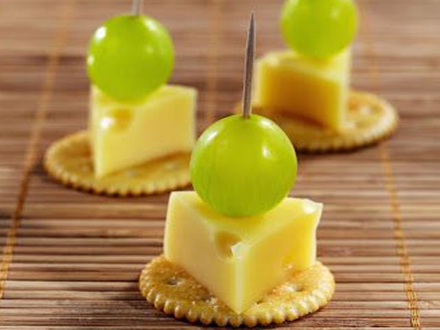 2. Зубочисткой, палочкой или шпажкой сначала проткнуть свежую зеленую или темную ягодку, затем сырный кусочек. Завершить нанизывание крекером.