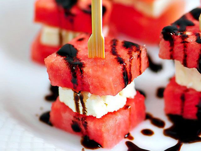 Красные ягоды с зелено-полосатой коркой сами по себе безумно вкусны. Но попробуйте к ним добавить нежный сливочный кремообразный сыр, орехи или виноград и арбуз заиграет новыми вкусными и ароматическими красками.