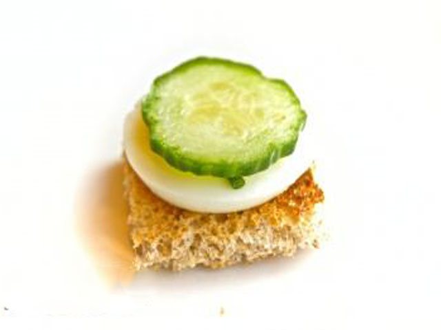 На сухарик уложить пластик яйца, а сверху огуречное колесико. Между ними можно проложить 1-2 маленьких перышка зеленого лука.