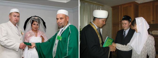 Обряд бракосочетания по Корану совершает мулла, представитель мусульманского духовенства, сначала в доме новобрачной, затем у жениха. Все посторонние оставляли жилище, кроме самой невесты, шафера и двух уже замужних женщин. Ритуал проводили от сглаза, оставляя в помещении только выше перечисленных участников обряда. Шафер три раза водил молодую вокруг очага, после рвал железную цепь или веревку. Этот обряд символизировал разрыв дочери с ее семьей.