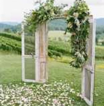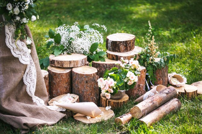 Зона выездной регистрации часто располагается на поляне, стулья из дерева или лавки для гостей ставятся на землю. Арка может иметь вид дверных створок, украшаться цветами и тканью.