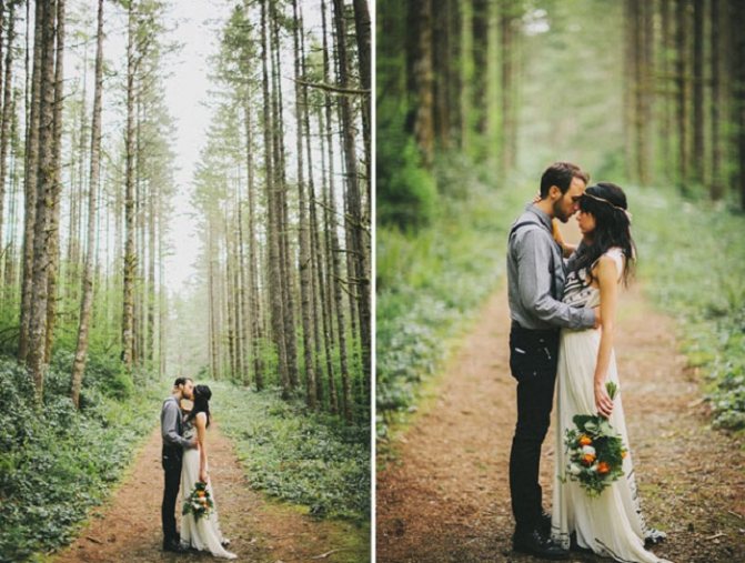 Лес подарит вам потрясающие фоны для свадебной фотосессии, особое чувство романтики, уединенности. Такие снимки будут нежными, чувственными. Спокойствие природы поможет вам расслабиться, свободно позировать фотографу на свадьбе. Погуляйте по лесу, найдите красивые поляны, деревья, поля с цветами. Чтобы придать таинственности фотосессии в тематике леса, можете воспользоваться спецэффектами и привезти с собой пару сов и дым-машину.