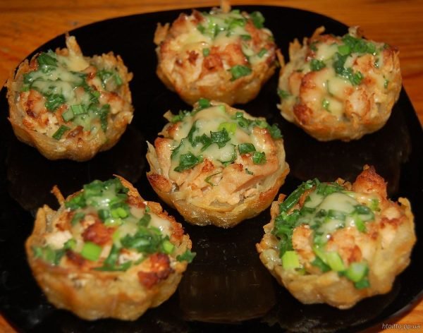 Тарталетки гостям понравятся точно, не пропустите их, составляя меню на День рождения дома из 20-ти человек — закуски такого рода оценят все! Блюдо – прекрасная закуска к алкоголю. Из других плюсов – ингредиенты самые обычные. Зато вкус у тарталеток получается очень изысканным. При этом они готовятся без теста. Тарталеткой служит картофель.