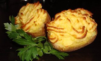 - Смесь укладываем обратно в картофельные лодочки. Чтобы получился красивый внешний вид, вилкой нанесите узор.