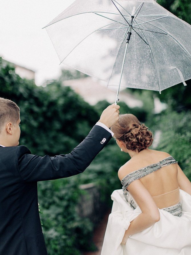 Больше всего дождь способен досадить свадебному платью – грязный и тяжелый от влаги подол не украсит даже Мисс Вселенную. Предусмотрите запасной вариант или сразу выберете наряд, который меньше пострадает от непогоды. В этом случае придется сказать нет пышной юбке и длинному шлейфу, отдав предпочтение легким тканям или даже короткому платью.