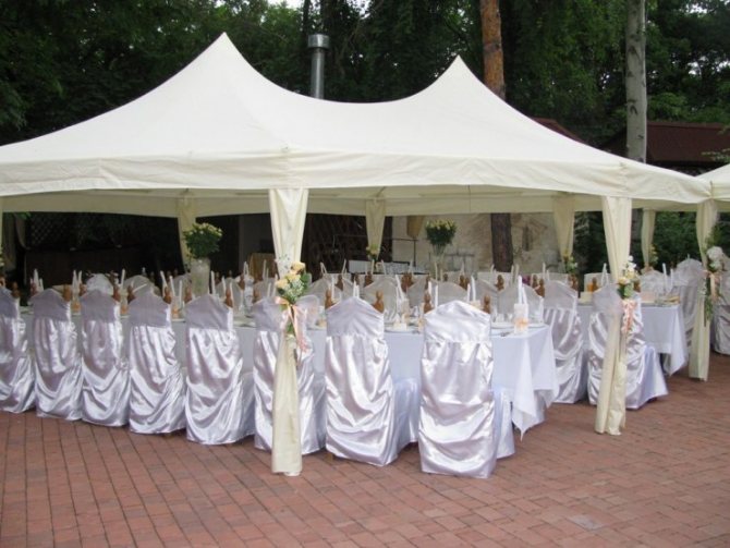 В начале необходимо озаботиться местом проведения свадьбы. Если планировалось отмечать свадебное торжество на свежем воздухе, то оптимальным решением будет установка праздничных шатров из водонепроницаемой ткани.