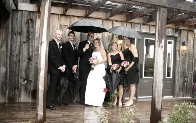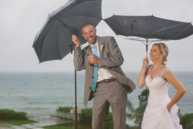 Подготовьтесь заранее, тогда свадьба в дождь пройдет великолепно. Помните главное – пока жених и невеста счастливы и улыбаются, родные и друзья будут получать удовольствие от торжества. Угрюмые молодожены, опечаленные погодой, расстроят даже самых оптимистичных гостей.
