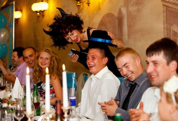 После молодых и их родни вызовите «самых смелых». Говорящая шляпа расскажет про их чаяния и мечты. Если на свадьбе мало людей, можно и не вытаскивать участников. Просто выберите взглядом человека и подойдите к нему. Смотрите за реакцией гостей: если они скучают, закончите конкурс. Объявите танцевальную паузу, чтобы все отдохнули, и переходите к следующему номеру.