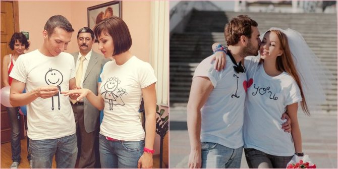 Часто пары одеваются в одном стиле и цветовой гамме. Одним из оригинальных примеров может быть look состоящий из джинсов и белых маек с принтами или с прикольными надписями: «Мой муж», «Моя жена», «Люблю мужа», «Люблю жену», «Лучший в мире муж», «Лучшая в мире жена» и подобными. Нередко девушка дополняет такой образ фатой, что смотрится уместно и интересно.