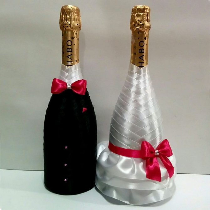 1.Создание подобия жениха и невесты путем украшения бутылок лентами и тесьмой: