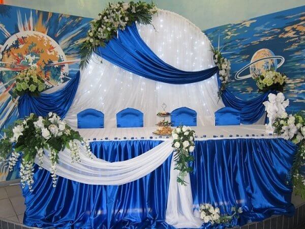Свадьба – торжество романтичное и нежное. Следовательно и цветовой разброс палитры должен быть в рамках «нежных чувств». Наиболее часто это ткани белые, пастельных тонов. Но это не догма. Современный подход к украшение тканью зала торжества не исключает использование полотен более ярких цветов, например, синего или желтого. Все зависит от ситуативной направленности торжества.