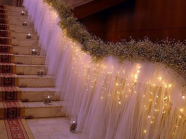 Если ресторан двухэтажный или в зале есть возвышение с лестницей, очень красиво будет задрапировать и ее. Обычно ткань красивыми складками укладывается на перила и между ними, в местах сборок крепятся цветы, такие же как и в композициях на столах или ленты. Аналогично можно украсить террасу беседку или арку для молодоженов на выездной регистрации.